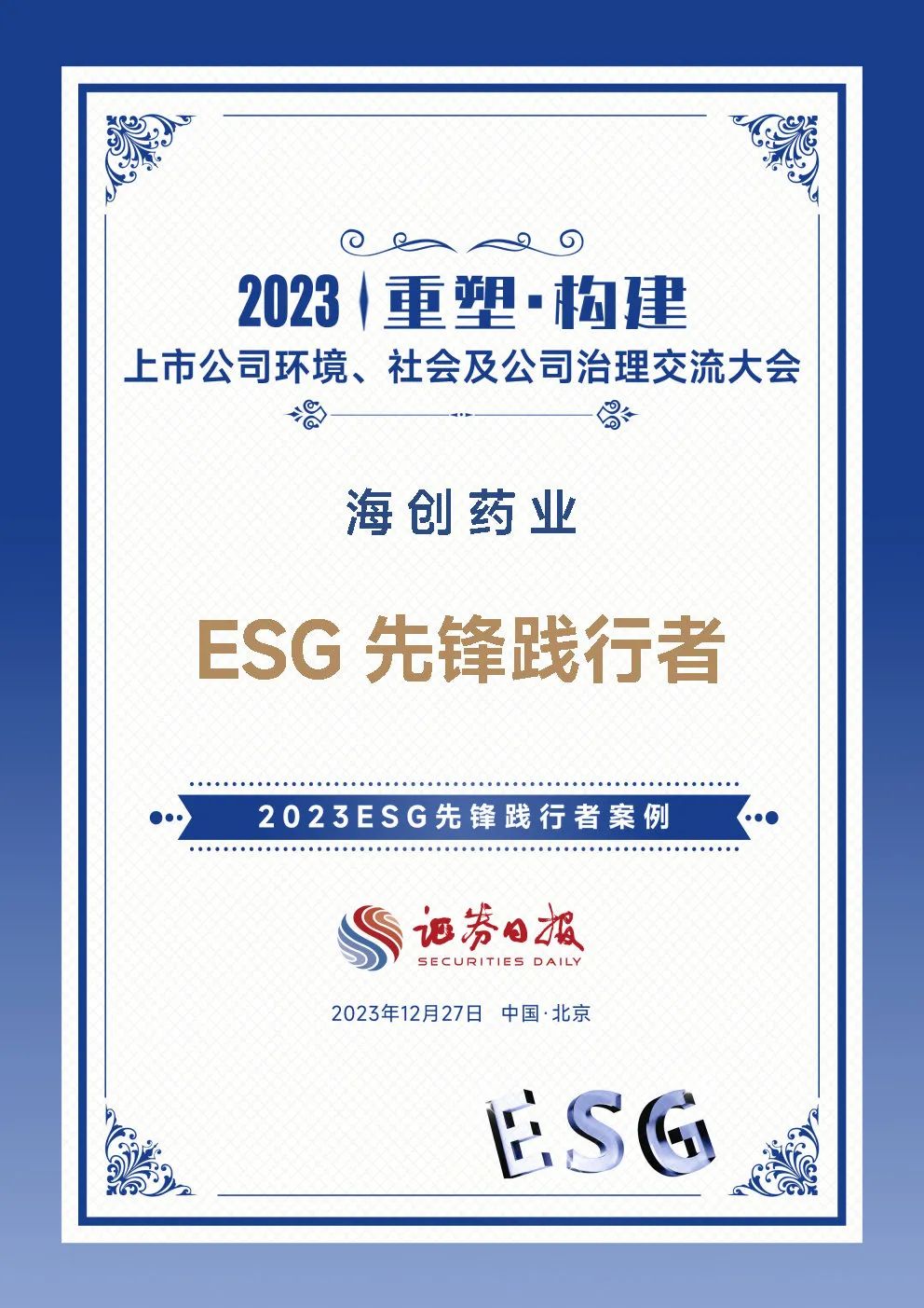 2023年12月27日,由證券日?qǐng)?bào)主辦的主題為“重塑· 構(gòu)建”的“2023環(huán)境、社會(huì)及公司治理發(fā)展論壇”( 2023 ESG發(fā)展論壇)于北京舉行。其中,海創(chuàng)藥業(yè)(688302.SH)榮獲“上市公司ESG先鋒踐行者案例”。
